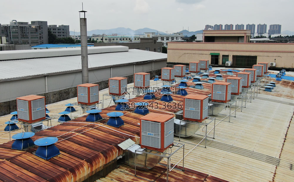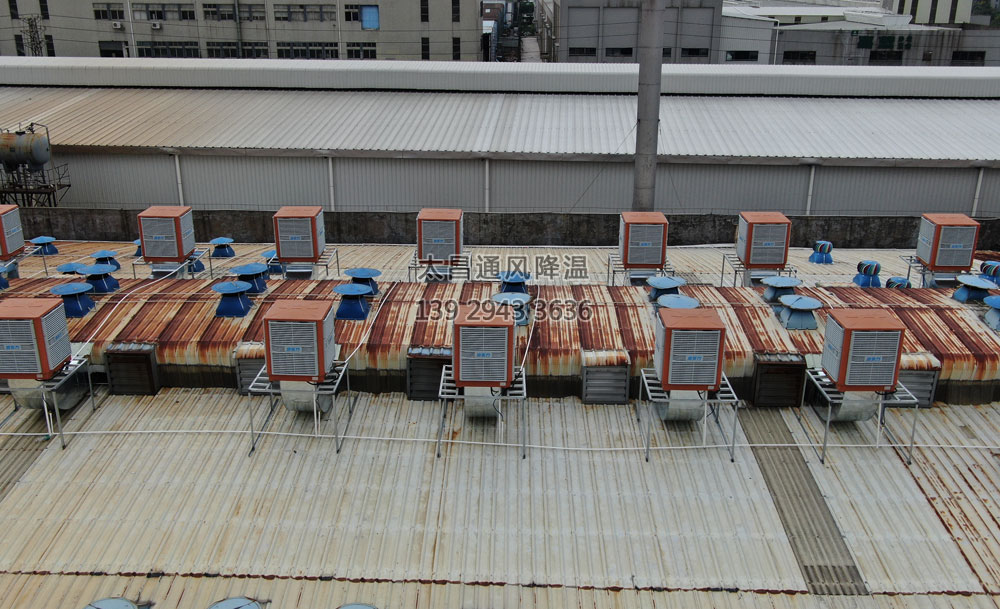 "潤(rùn)東方"環(huán)??照{(diào),安裝費(fèi)用低,運(yùn)行費(fèi)用少,平均每百平方米車間每小時(shí)降溫費(fèi)用僅需1度電,特別適合在生產(chǎn)型企業(yè)的車間里使用,下圖為東莞某大型鋼結(jié)構(gòu)車間安裝潤(rùn)東方環(huán)??照{(diào)的工程圖片: